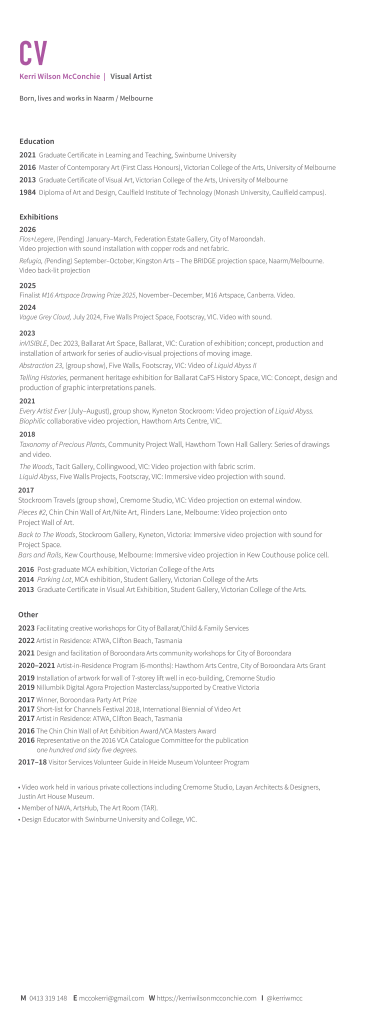 Kerri Wilson McConchie holds a Masters of Contemporary Art (2016), Graduate Certificate of Visual Art (2013) from the Victorian College of the Arts, Melbourne, and Diploma of Art & Design from Caulfield Institute of Technology (now Monash University, Caulfield campus).