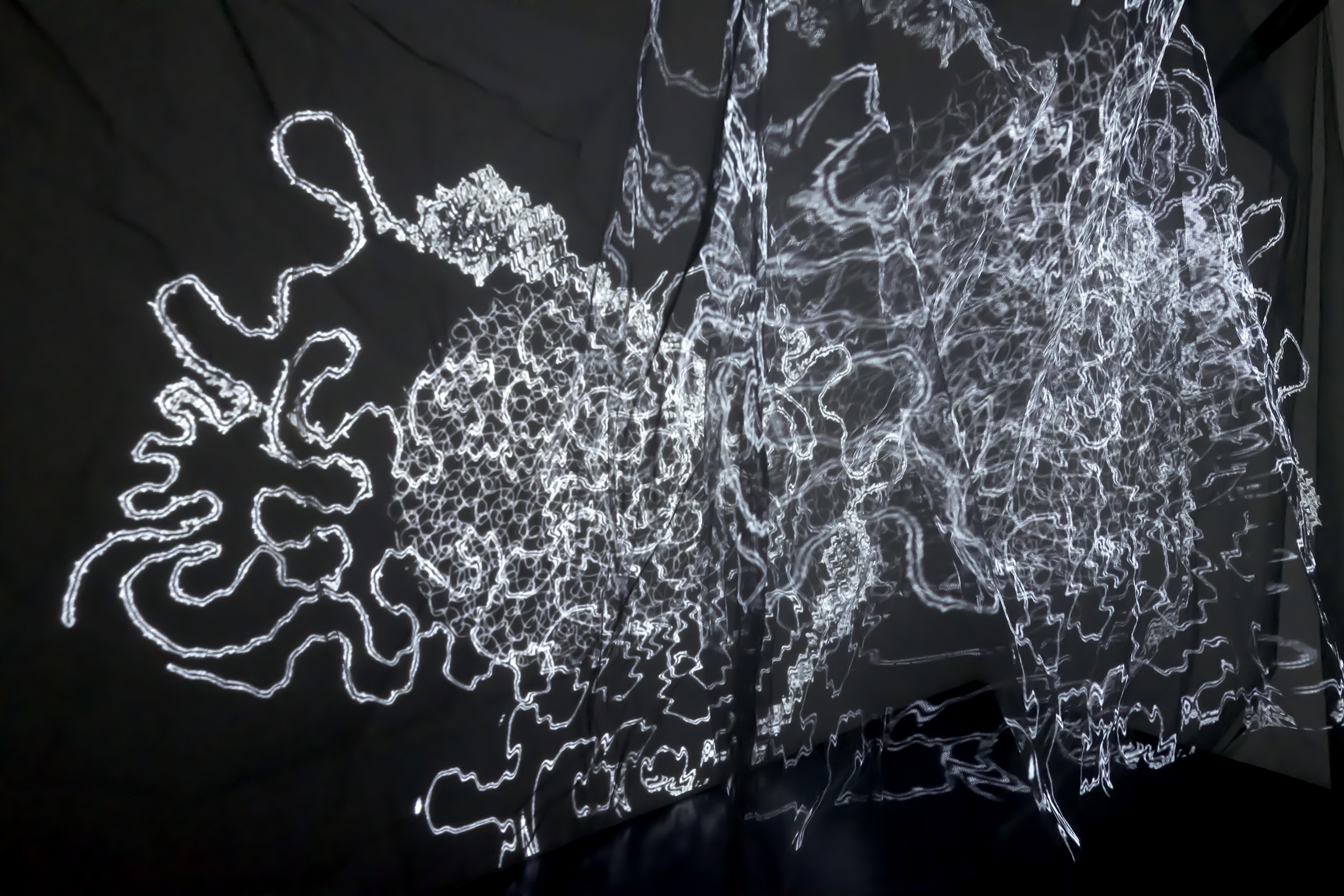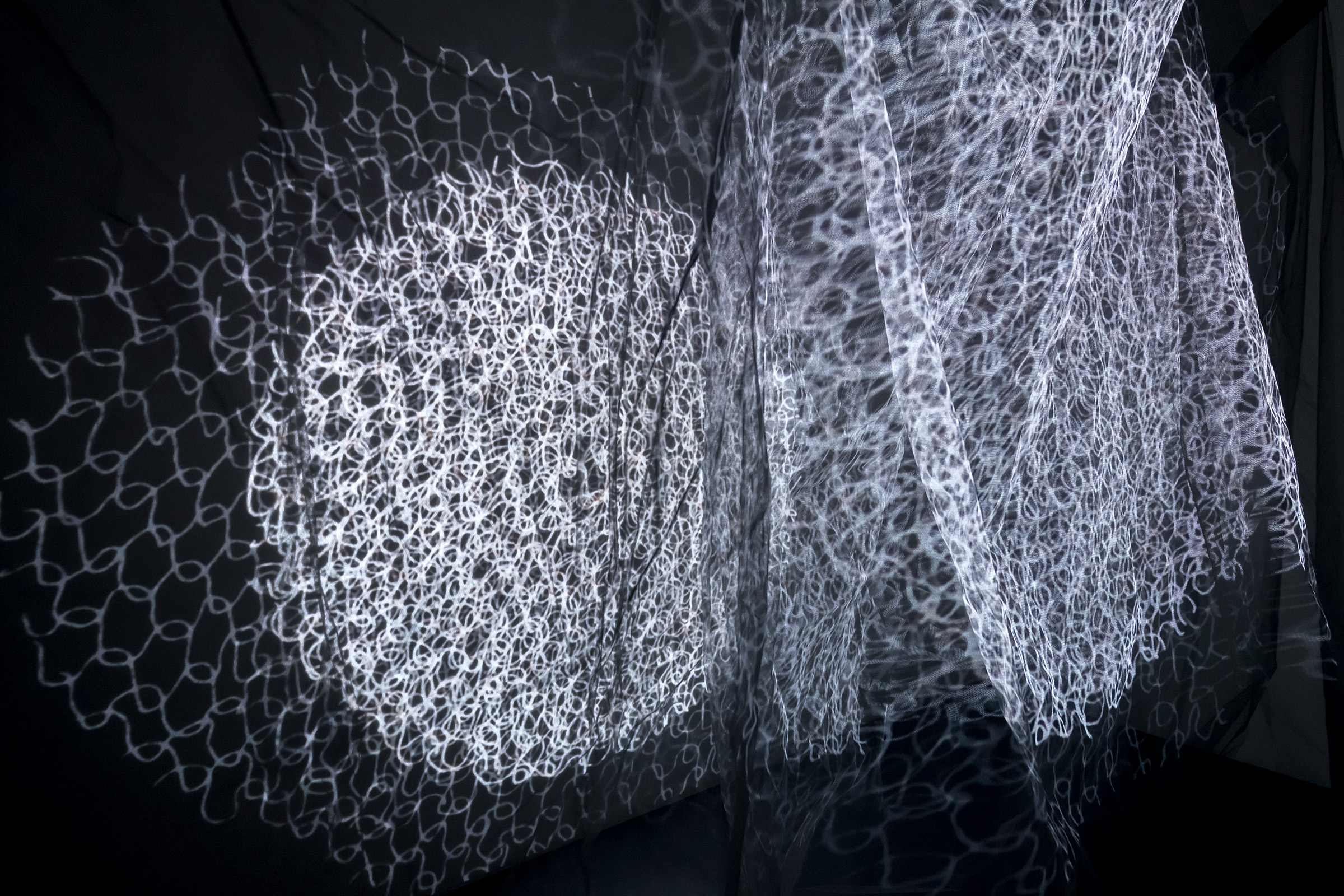 Liquid Abyss, 2018 installation view. One channel video projection, suspended net fabric.