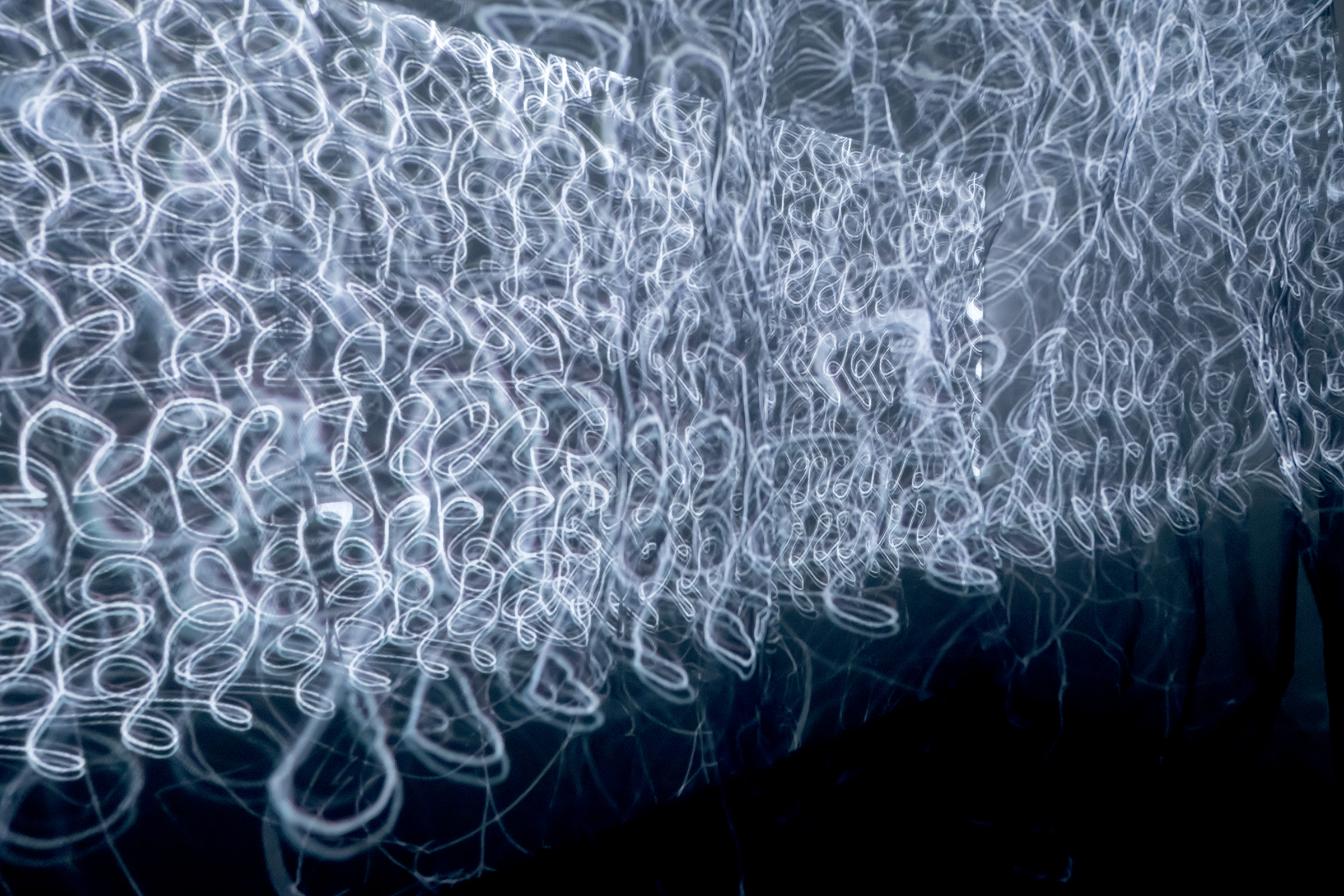 Deep sea dystopia or luminous wonderland? The deeper into the unknown, the more alien and bizarre – like dreams of a fleeting elsewhere. Liquid Abyss is an exploration of imagining oceanic life-forms of the Hadal zone. The ethereal and comical coalesce with the terrifying unknown and banal reality; a perpetual rain of detritus, human and otherwise.